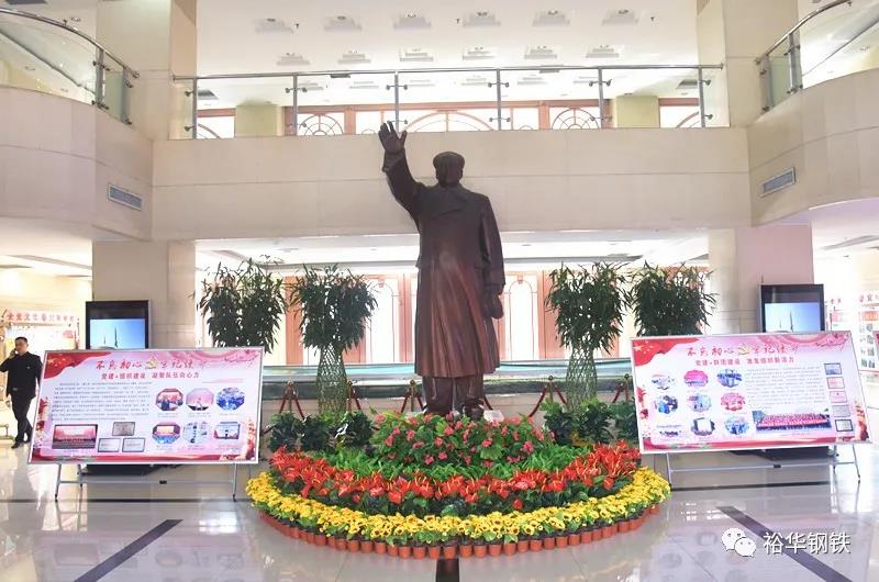 剛進(jìn)集團(tuán)辦公樓一樓大廳,觀摩團(tuán)成員便被眼前濃郁的黨建氛圍所吸引。鮮花叢中,高達(dá)三米的毛主席銅像巍然屹立在大廳中央,昭示著冀南鋼鐵集團(tuán)堅(jiān)定不移聽(tīng)黨話、跟黨走的決心和意志,六大板塊圖文并茂的黨建宣傳展板在銅像兩側(cè)依次擺開(kāi),令人一目了然。