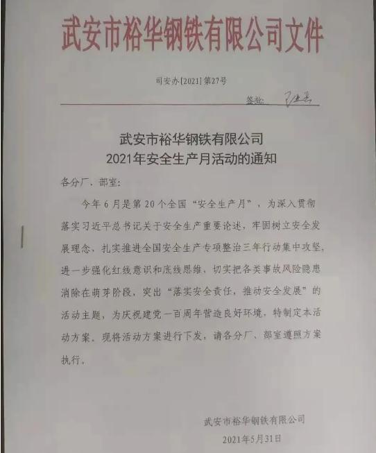 今年6月是第20個全國“安全生產月”,為深入貫徹落實習近平總書記關于安全生產重要論述,牢固樹立安全發展理念,扎實推進安全生產專項整治三年行動集中攻堅,進一步強化紅線意識和底線思維,切實把各類事故風險隱患消除在萌芽階段,突出“落實安全責任,推動安全發展”的活動主題,全力維護安全生產形勢持續穩定,為慶祝建黨百年營造良好環境,6月1日,裕華鋼鐵“2021年安全月啟動大會”在公司能源三樓會議室召開。